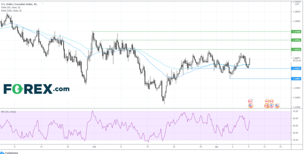 USD/CAD has traded relatively rangebound since the end of March. The pair has broadly traded within a horizontal channel capped by an upper band at 1.2650 and a lower band at 12550.