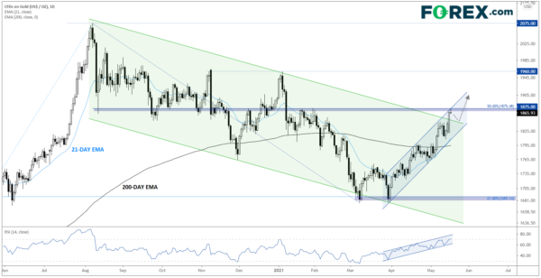 That said, the medium-term momentum has clearly shifted back in favor of the bulls, with the 20-day EMA providing support and the 200-day EMA turning higher for the first time in months. A confirmed break of $1875, if seen, could open the door for a continuation toward the next level of previous resistance at $1960 or key psychological resistance at $2000. Only a break below the bottom of the bullish channel and the 200-day EMA in the $1800 area would erase the near-term bullish bias.